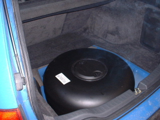| We fitted a 61 litre toroidal tank in the spare wheel well which makes a small bump in the boot carpet. A smaller (lower in height) tank could have been fitted but the owner wanted as much range as he could have whilst still retaining most of the load space. | |