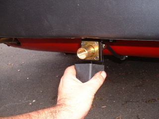 | The bumper mounted filler (centre of the picture) is easy to reach. This type of adapter is called the 'fixed bayonet' type and needs no adapter for use in UK. It is the only type of filler approved by the LPGA. |