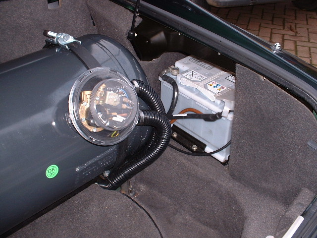 By far the most popular tank option, the 90 litre cylinder. Good, usable boot space remains. Notice the spare has been moved from its original vertical position and lain down on the boot floor. |