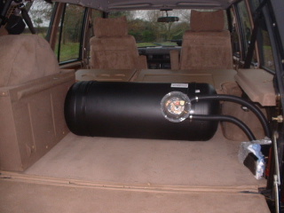 One 57 litre tank wasn't enough for the fuel capacity required on our car so a second 57 litre spare wheel tank, a vertical toroidal this time, was mounted in place of the spare wheel. After allowing for the 20% expansion space required for all automotive LPG tanks this Range Rover now has 91 litres of LPG capacity with no effect on the load space (save for the displaced spare wheel which some may wish to carry in the load space).