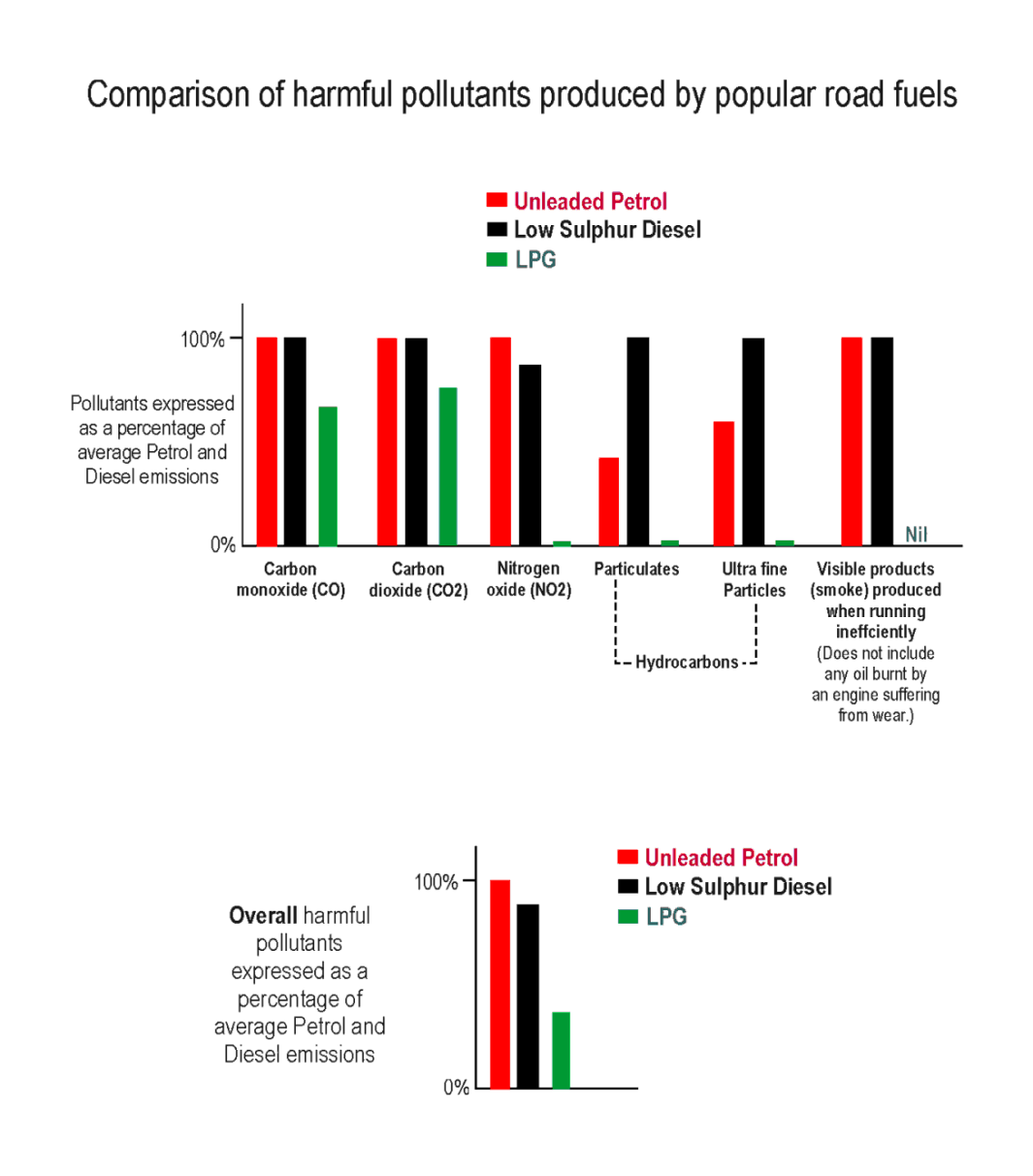 Above we have only considered the amounts of harmful pollutants resulting from the combustion of three different fuels. It is pretty clear that LPG beats them on all counts and wins again overall. That isn't the whole picture though. We must also be aware that fuels can pollute without being burned. Diesel or Petrol spilled into a watercourse (for instance) can decimate its animal and insect life and harm other creatures that come into contact with it (perhaps by drinking the water or bathing in it). Other things such as the Benzine that is now added to unleaded Petrol can be extremely harmful if only breathed in as fumes from unburned fuel or making contact with your skin. Both of these risks are present whilst you are simply filling your tank. (Benzine is now known to be a powerful carcinogen). LPG does not present us with any of these additional dangers. |